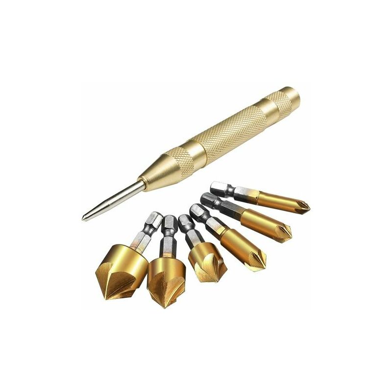 6 diverse dimensioni: Queste punte sono disponibili in 6 diverse misure di diametro: 6 mm, 8 mm, 9 mm, 12 mm, 16 mm, 19 mm. Utilizzo: Ideale per svasare fori di fissaggio in legno o plastica. Materiale: In acciaio ad alta velocità rivestito con titanio ultraresistente, queste frese si comportano anche nei materiali più duri. Cambio rapido: Con steli esagonali da 64 mm per un caricamento rapido. Non scivolerà nei mandrini. Bonus: 1 punzone automatico gratuito. Segna una fossetta nel materiale di lavoro per creare un punto di partenza che impedisca alle viti e alle punte di muoversi. Caratteristiche: Materiale: Acciaio ad alta velocità. Dimensioni: 6 mm, 8 mm, 9 mm, 12 mm, 16 mm, 19 mm Quantità: 1 set di 6 punte da trapano Lunghezza: 48 mm Contenuto della confezione: 1 punta da 6 mm 1 punta da 8 mm 1 punta da trapano da 9 mm 1 punta da 12 mm 1 punta da 16 mm 1 punta da 19 mm. 1 perforazione automatica.