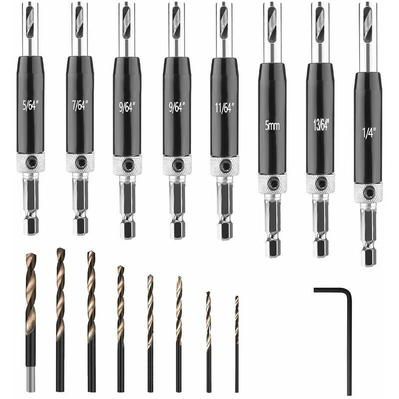 , 11/64", 13/64", 1/4", 5mm, 1/4" Il pacchetto include: 8 * Punte da trapano HSS autocentranti per cerniere 8 * Punte da trapano 1 * Chiavi esagonali