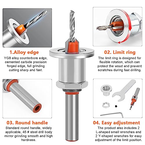 Rimovibile e regolabile: Punte con svasatore per legno rimuovere la vite con la chiave esagonale in dotazione e regolare la lunghezza del foro di svasatura per adattare la lunghezza di foratura di viti di diversa lunghezza.