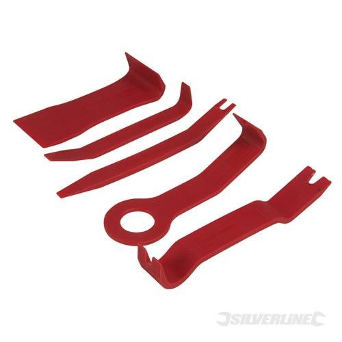 Set di 5 pezzi per la rimozione di finiture da carrozzeria di automobili, tappezzeria, clip, cornici e mozzi delle ruote di auto, furgoni e veicoli commerciali. La struttura in fibra di vetro e nylonresistenti evita che i pannelli si graffino o danneggino. L'area di supporto molto grande fornisce leveraggio massimo. Include strumenti per la rimozione di clip della tappezzeria stretti, larghi, a trazione e a maniglia.