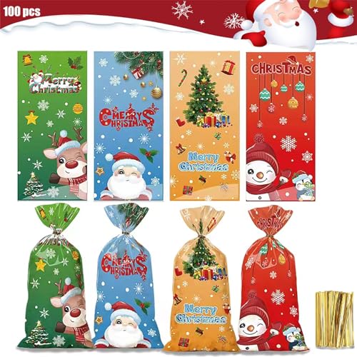 100 Pezzi Sacchetti Biscotti di Natale,Sacchetti per Biscotti Caramelle di Natale, Sacchetti di cellophane Natalizio,Con 150 Pezzi Twist Tie,27.5 x 13 cm