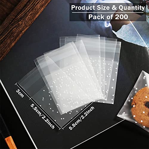 200 Pezzi Sacchetti Cellophane Trasparenti, Sacchetti di Biscotti Autoadesivi Plastica con Pois Pallini Bustine per Biscotti, Caramelle, Cioccolati, Prodotti da Forno, Gioielli (5,5 × 5,5+3cm)