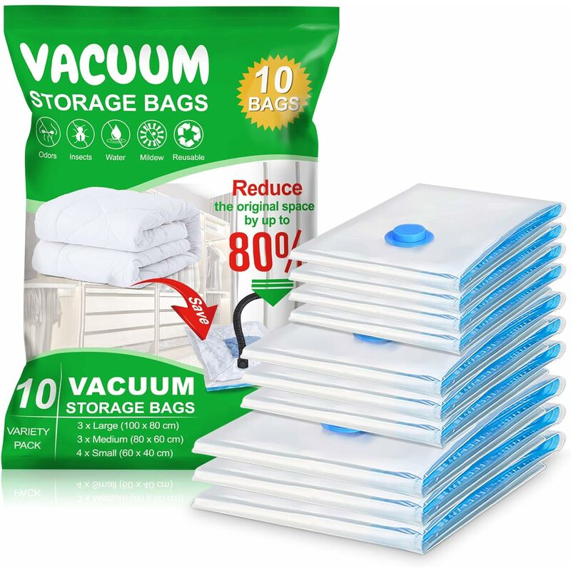 10 borse - Risparmia più spazio -Può essere utilizzato per riporre oggetti di diverse dimensioni, come vestiti, lenzuola, coperte, cuscini, peluche, ecc - Contiene 3 diverse dimensioni di sacchetti sottovuoto per soddisfare le diverse esigenze. -Può aiutare a ridurre lo spazio di archiviazione di 3 volte. -Puoi mettere molte cose in queste borse, anche il piumino più grande, il cuscino, la coperta o il telo mare gigante.