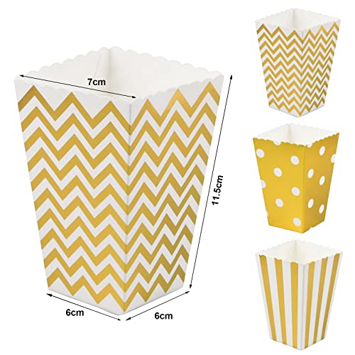 【Informazioni sull'imballaggio】La confezione include 18 scatole di popcorn in carta dorata. 3 modelli in totale: pois, righe, onde. 6 pezzi per ogni modello. La quantità è sufficiente per l'uso quotidiano, feste o festività. Questi colori dorati illumineranno la tua festa o la tua tavola.