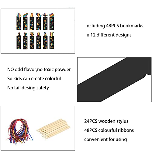 48 Pezzi Segnalibri Per Bambini,Scratch Art Bambini,Bambini Compleanno Segnalibri,Segnalibro Arcobaleno,Segnalibro Scratch Animali,Contiene 24 Spille Nastri In Legno Per Ragazze, Ragazzi, Feste