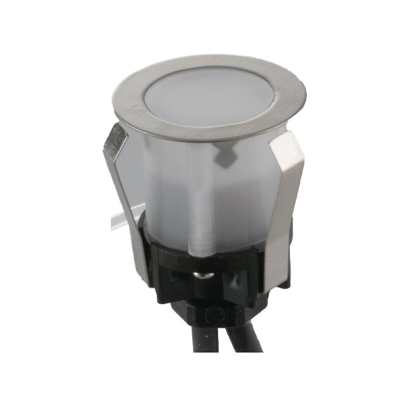 Colore: Nichel Materiale: Acciaio Tipo sorgente o lampadina richiesta: LED Watt: 0.6 Lumen: 100 Lumen Kelvin: 4000K Grado di protezione da corpi solidi e acqua: IP67 Altre informazioni: 6 cavi 1,5 mt. con spina e trasformatore 12V 6W DC inclusi IP44 (adatto all'esterno con esposizione limitata);