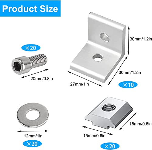 Dettagli confezione: 10 staffe angolari(30 x 30 x 27mm), 20 bulloni di fissaggio(M6 x 12), 20 dadi(M6 x 16 x 6), 20 rondelle(M6).