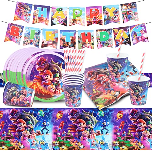 52 Pezzi Set Stoviglie per Feste,Decorazioni Feste,Compleanno Stoviglie,Tazze Piatti Asciugamani di Carta Cannucce Banner Tovaglia Stoviglie per Feste e Compleanni per Bambin.