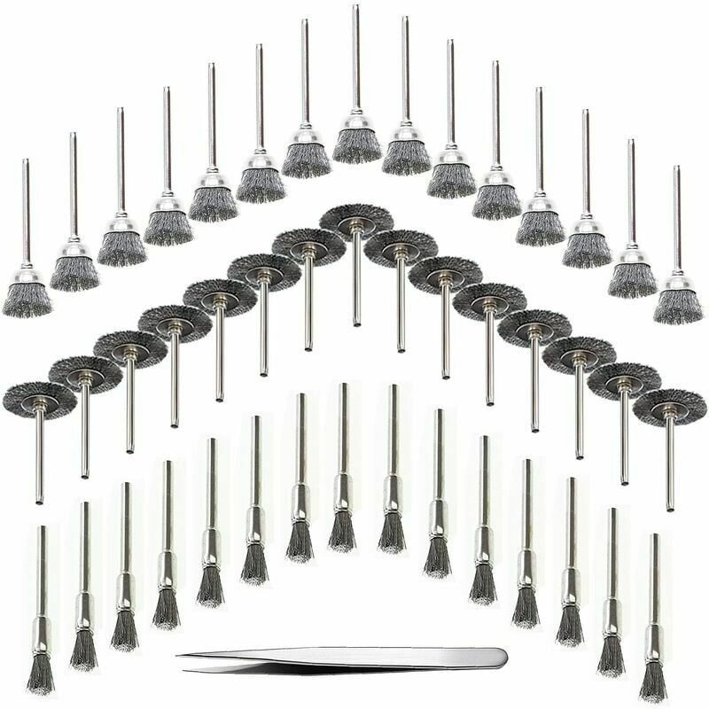 Set di spazzole metalliche - - 45 pezzi di diverse spazzole metalliche, per un totale di 3 modelli, tra cui 15 spazzole a ruota, 15 spazzole a tazza e 15 spazzole. [Varie dimensioni] -Diametro impugnatura: 3 mm (1/8 di pollice), spazzola per ruote: 23 mm / 0,9 pollici, spazzola a tazza: 15 mm / 0,6 pollici, spazzola: 5 mm / 0,2 pollici. [Materiale di alta qualità] - Il set di spazzole metalliche è realizzato in acciaio inossidabile, che è resistente e ha una lunga durata nei lavori di pulizia più difficili. [Rimozione e lucidatura della ruggine] - La spazzola metallica è molto adatta per la rimozione della ruggine, la rimozione della ruggine, la rimozione delle sbavature, la rimozione della schiuma, la rimozione della vecchia vernice, la pulizia meccanica e la lucidatura di scanalature o bordi su superfici metalliche. [Ambito di applicazione] - Set di spazzole in metallo, adatto per la rimozione della ruggine e la pulizia di metalli fini, legno, pietra, materiali metallici e altri