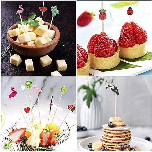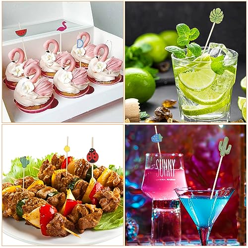 Stuzzicadenti decorativi: Riceverete 100 pezzi stuzzicadenti cocktail con motivi tropicali (tra cui fenicottero rosa, fenicottero rosso, cactus, coccinella, foglia, foglia di palma, anguria, corvo, ananas) e 100 pezzi bastoncini per spiedini colorati con motivi floreali.