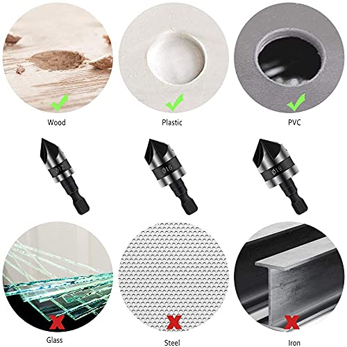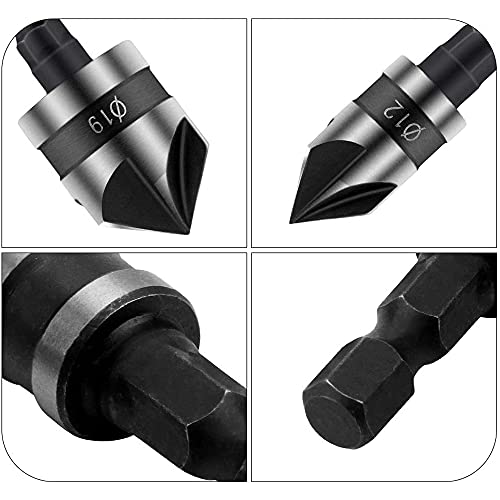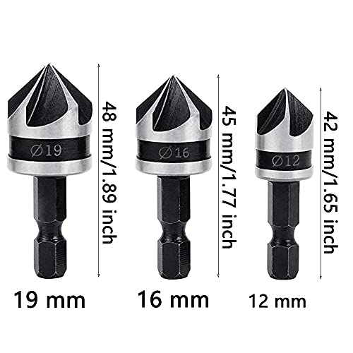 6 Pezzi Svasatore Punta da Trapano, Punte per Svasatura di Legno, Svasatore in Acciaio al Carbonio, Codolo Esagonale Punta, Trapano a 5 Taglienti a 90 Gradi, per Forare e Smussare (12mm, 16mm, 19mm)