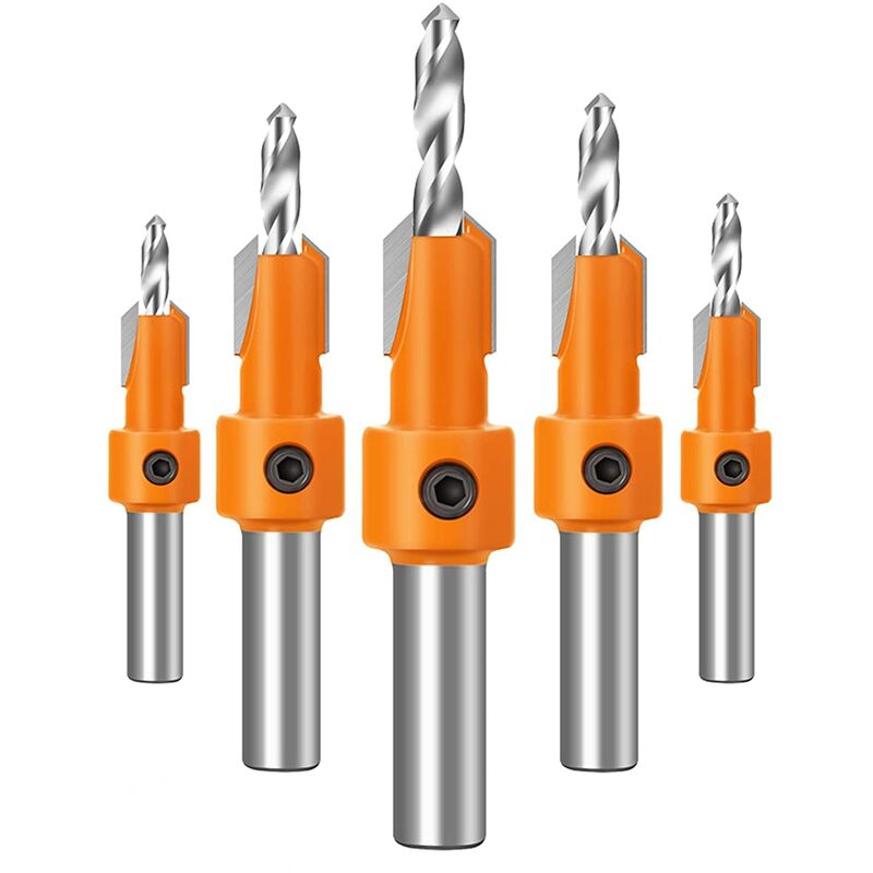 Realizzata in classico acciaio al carbonio, ad alta durezza, la lama è affilata, resistente e ha una lunga durata Utilizza la chiave esagonale per regolare la profondità della contromanica e la profondità della foratura per viti di diverse lunghezze. Specifiche complete possono soddisfare tutte le tue esigenze Adatto per trapano da banco, trapano a mano e trapano elettrico convenzionale. Perfetto per legno, fibra di legno, truciolare, compensato, plastica, PVC, gomma, ecc. Puoi eseguire una punzonatura precisa in modo rapido e preciso. La filettatura esterna può aiutare a evacuare i rifiuti durante la perforazione, per garantire la buona riuscita della perforazione Contenuto della confezione: 5 punte per la lavorazione del legno, molto adatte per l'uso con fori di diverse dimensioni Punte per trapano svasatore professionale per legno Le nostre punte per trapano svasatore per tagliaviti per legno sono rigorosamente prodotte con materiali di alta qualità, che è di dimensioni più precise