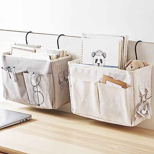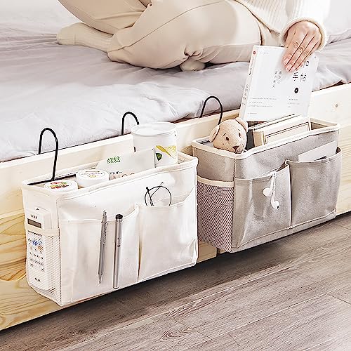 2 Pezzi Tasche da Comodino, Tasche da Letto Appendibile Borsa da Comodino per Organizer Sospesa Portaoggetti da Letto Appendibile Pratici Accessori,per Riviste, Telecomando,Ecc(Grigio, Bianco Crema)