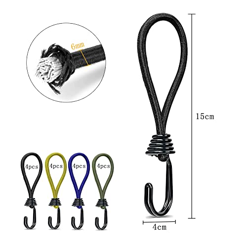 Set di ganci: 16 pezzi di ganci in corda elastica, 4 pezzi gialli, 4 pezzi verde militare, 4 pezzi blu, 4 pezzi neri, lunghezza 15 cm, diametro 6 mm. Colori vivaci tra cui scegliere e utilizzare.