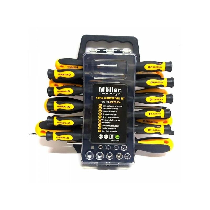 KIT SET 44 PEZZI TORX ESAGONALI CACCIAVITI PUNTE INSERTI BUSSOLA Set composto da cacciaviti, inserti e bussole per un totale di 44 pezzi. Contenuto 6 cacciaviti piatti: 8x150mm, 6x125mm, 5x100mm, 3x75mm, 2.5x50mm, 3.0x50mm 5 cacciaviti a stella: PH2x125mm, PH1x100mm, PH0x75mm, PH00x50mm, PH0x50mm 6 cacciaviti TORX: T5, T6, T7, T8, T9, T10 (x50mm) 16 inserti misti 9 bussole 1/4: 4, 5, 6, 7, 8, 9, 10, 11, 12mm 1 adattatore 1 manico porta inserti Il tutto in un pratico contenitore