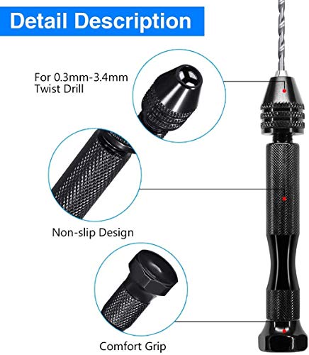 Trapano a mano regolabile: 3 mandrini in acciaio temprato con artigli, il trapano a mano può essere dotato di numerosi trapani. Ruotare leggermente la testa della morsa per bloccare la punta da 0,3 a 3,4 mm. Mandrino preciso per tenere il trapano in posizione verticale.