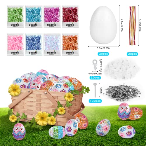 Decorazione pasquale: il set per il fai da te include 20 uova di polistirolo di alta qualità (5,8 x 4,2 cm), 8 paillettes colorate rotonde in diversi colori, 20 ganci in plastica, 20 nastri di raso colorati da appendere e 300 spille (12 mm). Sufficiente per creare 20 uova di Pasqua.