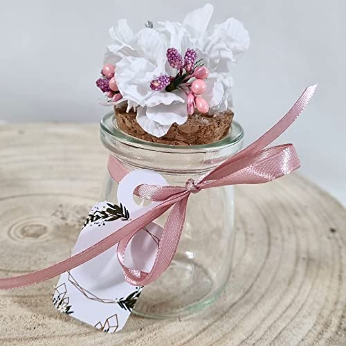 20 Pezzi vasetti Tappo Sughero Fiori Porta Confetti bomboniere, Tag e Nastri (Fiore Bianco e Rosa)