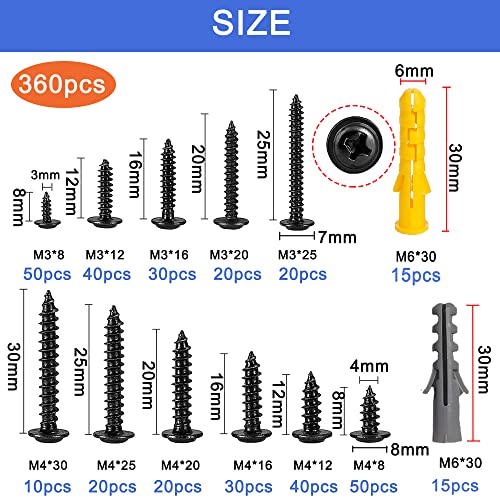 【11 Dimensioni】360 pezzi viti autofilettanti con testa a croce. Le dimensioni sono: M3x8/12/16/20/25 mm, M4x8/12/16/20/25/30 mm, spine di espansion.