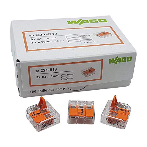 30 pezzi Wago Morsetto di collegamento 3 conduttori con leva di comando 0,5-6 qmm esecuzione piccola, trasparente