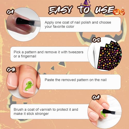 【Varietà di Stili】Il set Stickers Unghie Nail Art per unghie è composto da un totale di 9 fogli, che includono una varietà di motivi classici di Halloween, come zucche, teschi, pipistrelli, ragnatele, fantasmi, ecc.