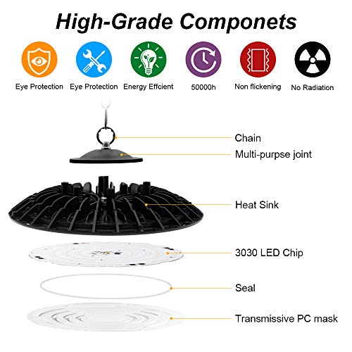 【Efficienza Energetica Rispettosa Dell'ambiente】: la lampade industriali a luce diurna a LED utilizza chip LED SMD3030, garantisce risparmio energetico, basso consumo energetico e maggiore durata, lampada del garage consente di risparmiare un massimo dell'80% sui costi energetici. La dissipazione del calore della lampada da lavoro ufo è del 25% migliore rispetto a prodotti comparabili.