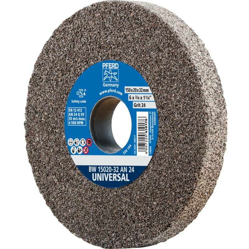 Dettagli tecnici Contenuto 1 pz. Dimensione, Ø 150 mm Grana Num. 24 Tipo prodotto Disco per smerigliatrice Modello: UNIVERSALE Ø foro: 32 mm Max. GIRI/MIN: 4500 GIRI/MIN Riduzioni: 25 x 20 x 16 mm Abrasivo: A Materiali lavorabili: Acciaio inossidabile (INOX) ghisa acciaio Operazioni di lavorazione: Sbavatura lavorazione bordi (smussi, arrotondamenti) affilatura Tipi di azionamento: Smerigliatrice Disco abrasivo modello UNIVERSALE 150 x 20 mm, dimensione grana 24 Le mole a disco della versione UNIVERSAL sono Ideal per l'uso universale in officina. Testo tradotto automaticamente Incluso nella consegna null Requisiti di sistema null Note Il numero di anelli di riduzione in dotazione dipende dalle dimensioni del disco per smerigliatrice. Illustration similar.