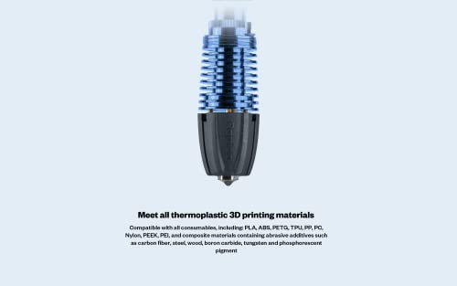 Design intercambiabile di diversi tipi di ugelli che si adatta alle impostazioni di stampa ad alta temperatura e filamenti in fibra.