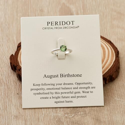 Realizzato con fiducia. August (Peridot) Anello con pietra portafortuna regolabile creato con cristalli di zircone di Philip Jones. Acquista con fiducia con la nostra garanzia del produttore di 12 mesi e la garanzia di rimborso di 30 giorni se non sei soddisfatto al 100% del tuo anello.