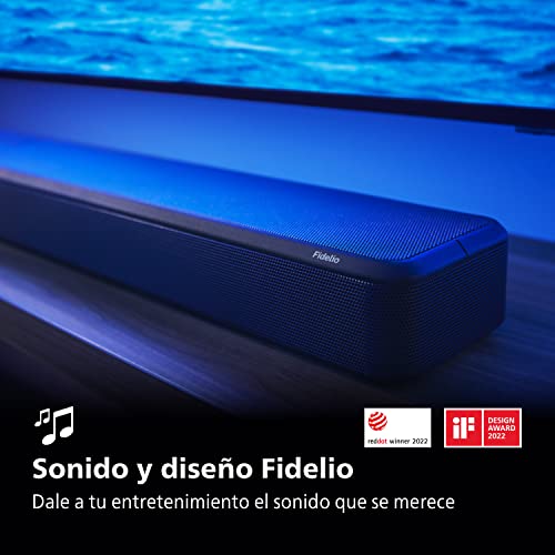 7.1.2 CANALI E 620 W: Questa soundbar a 7.1.2 canali è dotata di diffusori Fidelio personalizzati con 620 W di potenza, tra cui due diffusori up-firing per una maggiore presenza surround e un subwoofer integrato per la perfezione dei bassi.