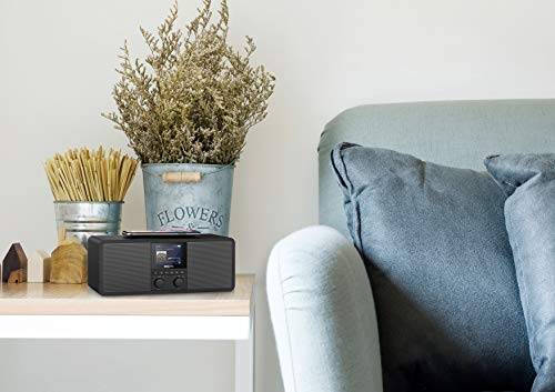 La radio digitale convince per il suo suono eccellente, e suo involucro di legno nero opaco. Sul display a colori da 2,4 pollici vengono visualizzati le informazioni relative ai titoli.