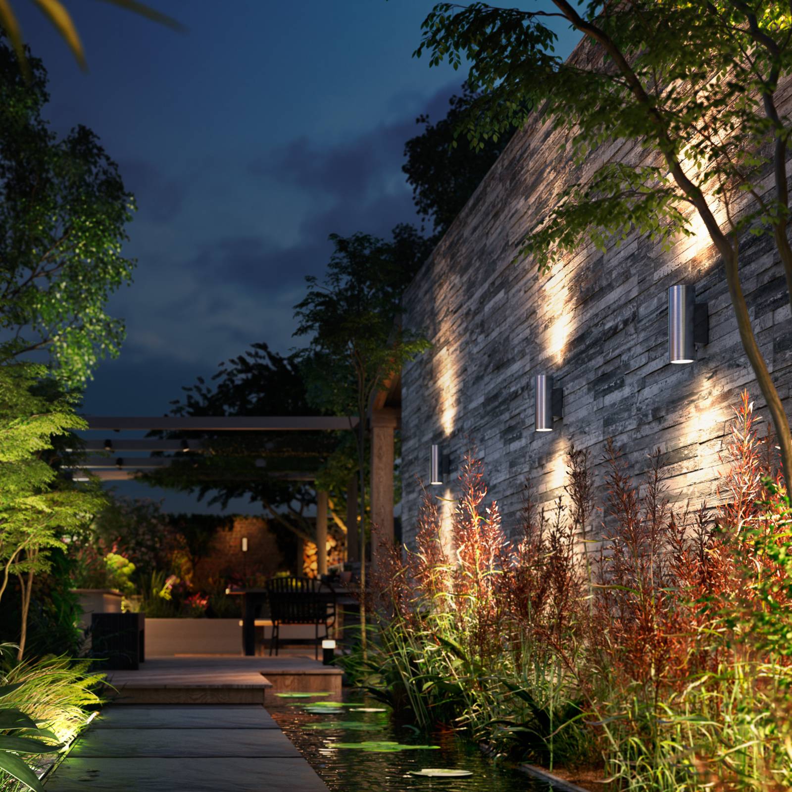 Smart Up-and-Down Outdoor Wall Light Philips Hue bianco e colore ambiente appaiono come un cilindro in acciaio inox L'applique a LED per esterni Appear con White e Color Ambiance offre una vasta gamma di opzioni di illuminazione - dall'illuminazione discreta di orientamento alla decorazione luminosa colorata per la festa in giardino. Ha un design visivamente moderno come un cilindro in acciaio inossidabile resistente alle intemperie, che ha aperture di luce nella parte superiore e inferiore. Il clou è la funzionalità, che risulta da un lato dai LED con tecnologia avanzata White e Color Ambiance. Questo permette di selezionare la luce bianca dal bianco caldo alla luce del giorno, nonché la luce colorata in 16 milioni di colori con dimmerabilità continua. D'altra parte, Appear è abilitato a ZigBee, in modo che tutte le impostazioni possano essere fatte in modo intelligente. Questo viene fatto dopo l'integrazione in Philips Hue (ponte richiesto - vedi accessori) o altri sistemi basati su ZigBee tramite app. Inoltre, l'applique esterna può essere accoppiata con altri componenti intelligenti, integrata in scene o per il controllo vocale. Dati tecnici / compatibilità: - controllabile e dimmerabile tramite l'app Hue - da bianco caldo (2.000 K) a bianco luce del giorno (6.500 K) - 16 milioni di colori per un'illuminazione esterna impressionante - Compatibile con il sistema Philips Hue esistente - Controllo vocale possibile con Amazon Alexa, Apple HomeKit e Google Assistant - collegabile in rete con il rilevatore di movimento Hue Outdoor Sensor (vedi accessori) - compatibile con Hue Sync - luce in armonia con la musica - è necessaria la connessione con il ponte Hue (vedi accessori) Nota: Per il buon funzionamento dell'illuminazione esterna Hue, la prima luce esterna dovrebbe essere al massimo a 10 m dal ponte interno o da una lampada Hue. Dopo di che, tutte le altre luci devono essere installate a una distanza massima di 20 m. Tuttavia, più piccola è la distanza, meglio è.