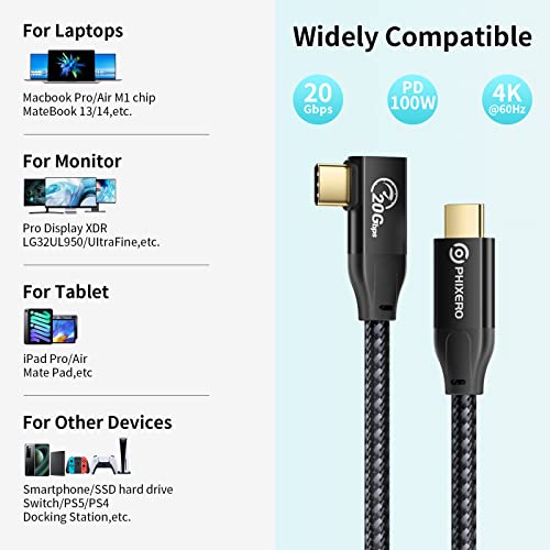 PHIXERO Cavo da USB C a USB C 10 piedi (20 Gbps, 100 W), Cavo USB C 3.2 Gen 2x2 ad angolo retto con uscita video 4K, compatibile con Thunderbolt 3 computer portatile, Samsung Galaxy S22/21/20