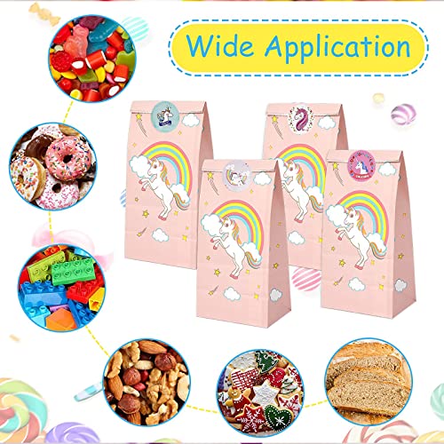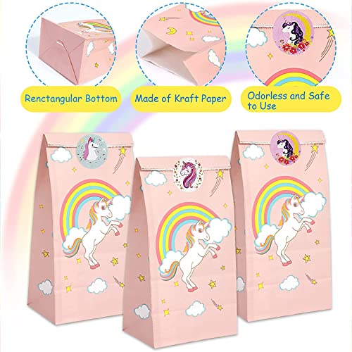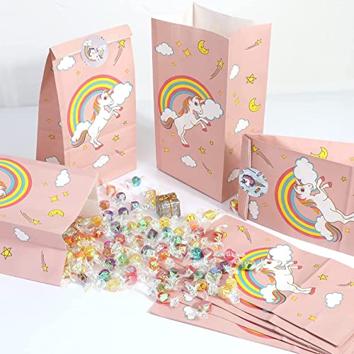 PHOGARY Confezione Regalo da 60 Pezzi, 24 sacchetti di carta con unicorno arcobaleno rosa + 36 adesivi per Feste di Compleanno Bambini