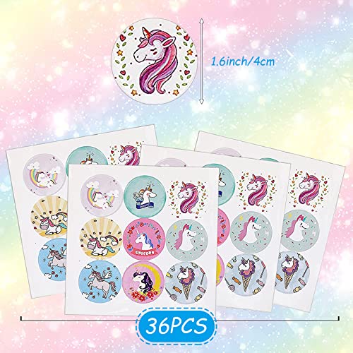 Adesivi unicorno: stampati su carta adesiva di alta qualità con 36 simpatici disegni di unicorno e un disegno con brillantini nel cerchio rotondo da 1,6 pollici. Utilizzato per sigillare inviti per feste, bottiglie d'acqua, buste, borse per bomboniere per unicorno, sacchetti, sacche per bottino, sacchetti di caramelle e molto altro !!!
