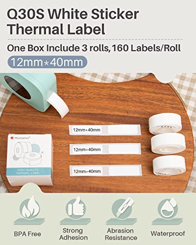 Phomemo D30 Q30S Etichette, Etichette Bianche Termiche Autoadesive per Stampante di Etichette Phomemo D30, Q31, Q30S, Q30,12×40mm,160 Etichette/Per Rotolo, 3 Rotoli