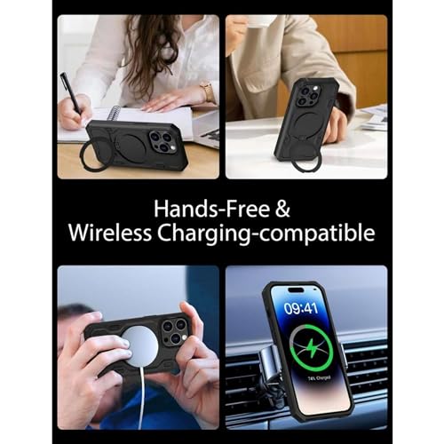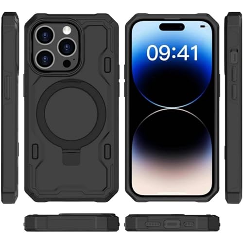 PhoneMoov Cover per iPhone 15 Pro Max Premium da uomo, nero, base armatura imbottita custodia ad alta protezione anti-shock anti-graffio anello supporto girevole maniglia assorbimento magnetico