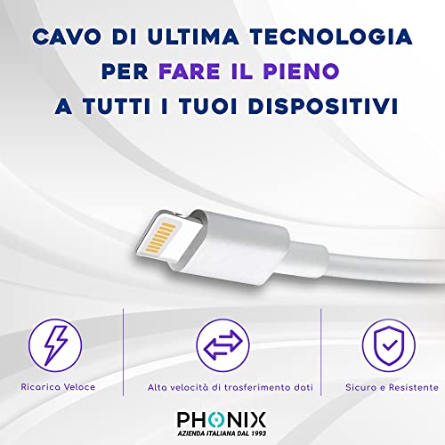PHONIX Caricatore per Iphone 12 11 Pro Max Mini X 8 7 SE 6 5 + Cavo USB Lightning da 1 mt. | GARANZIA ITALIANA Alimentatore per Apple con Cavetto di Ricarica per iPhone, iPad, AirPods