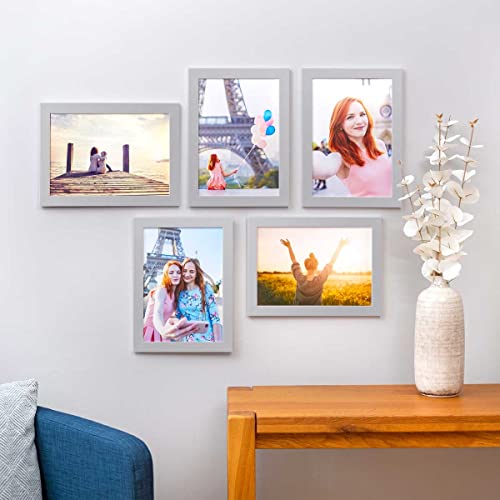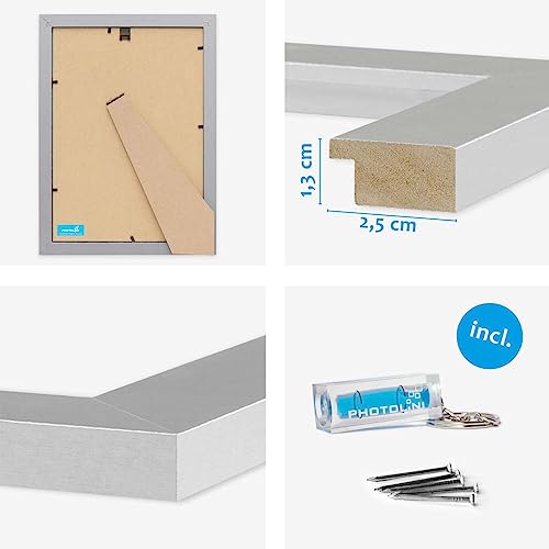 PHOTOLINI Cornici A4 21x30 cm argento legno MDF, set di 5 cornici larghe, moderne, plexiglass infrangibile, da tavolo o da parete, accessori extra - per una parete dal look raffinato