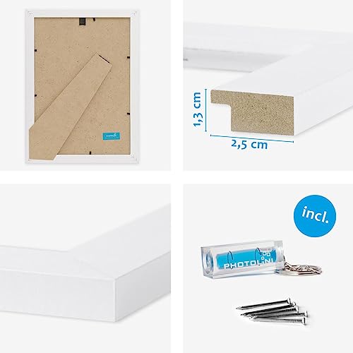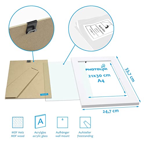 PHOTOLINI Cornici A4 21x30 cm bianco legno MDF, set di 5 cornici larghe, moderne, plexiglass infrangibile, da tavolo o da parete, accessori extra - per una parete dal look raffinato