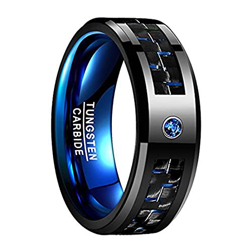 Phyonio Uomo Anelli 8mm Nero Tungsteno anello con Blu Fibra Carbonio e Zircone Taglia 22,5