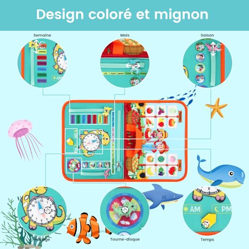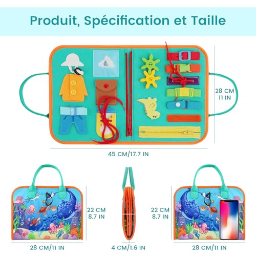 【Giocattoli didattici prescolari】Innanzitutto, la copertina del Sensory Montessori busy board è realizzata con una varietà di creature marine dalle forme uniche e adorabili, che possono attirare notevolmente l'attenzione dei bambini. In secondo luogo, i giocattoli per bambini includono molti contenuti e attività, come l'alfabeto, frutta e verdura, puzzle, bottoni, lacci, cerniere, orologi, velcro, ingranaggi, ecc.