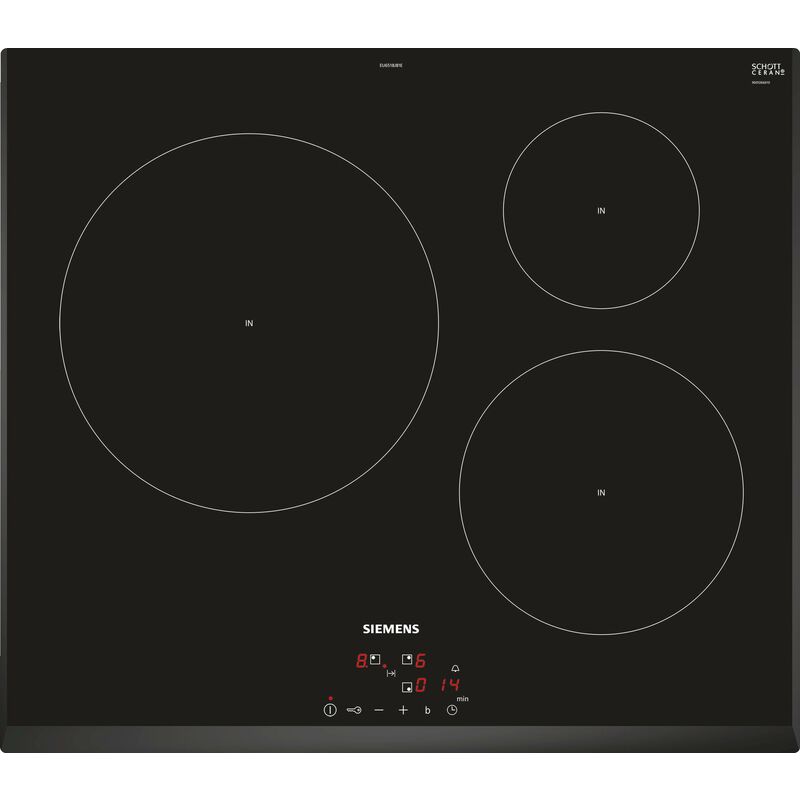 Piano cottura a induzione Siemens iQ100 EU651BJB1E bordi bisellati. Piano cottura a induzione con nuove funzioni innovative, per una grande flessibilità in ogni situazione Grazie al touchControl, le zone di cottura possono essere attivate e controllate con il semplice tocco di un dito Induction, una tecnologia innovativa, che riduce i tuoi tempi di cottura, facilita la pulizia e ti offre maggiore sicurezza .Grazie alla funzione powerBoost, il tempo di preriscaldamento è fino al 50% più veloce.Design: - Display digitale.- Comando TouchControl (+/-). Potenza: - 3 piastre a induzione - Zone di cottura: 1 x Ø 280 mm, 2,6 kW (PowerBoost 3,7 kW), 1 x Ø 145 mm, 1,4 kW (PowerBoost 2,2 kW), 1 x Ø 210 mm, 2,2 kW (PowerBoost 3,7 kW Comfort / Sicurezza: - Funzione QuickStart: rilevamento automatico dei contenitori sulla zona di cottura - reStart funzione: in caso di arresto improvviso del piano, memorizzazione della temperatura iniziale per 4 secondi - 17 posizioni di regolazione - powerBoost su
