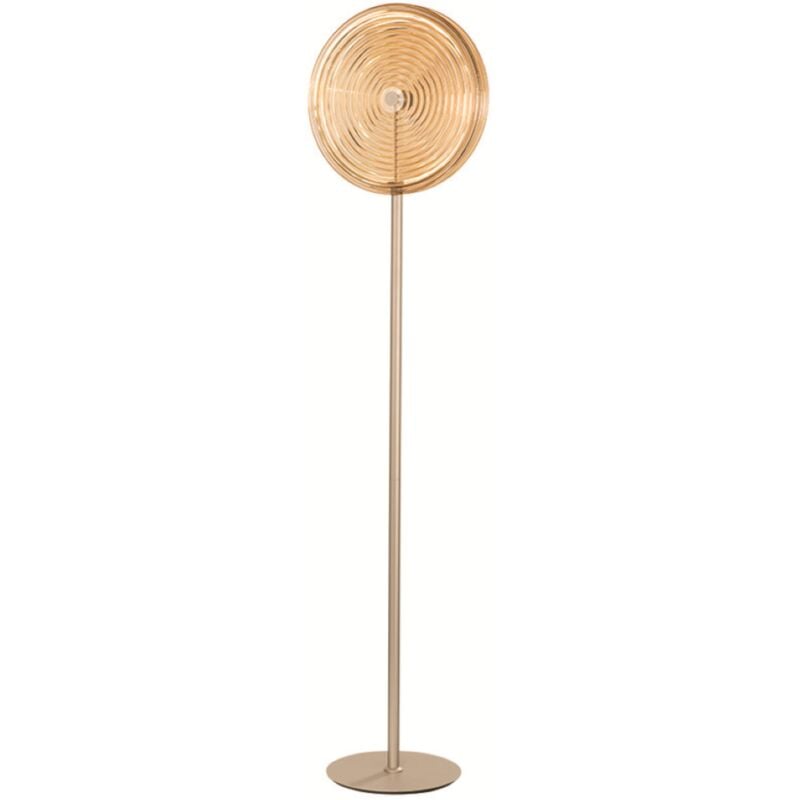 Lampada da terra Led JOKEY realizzato in vetro decorato a righe concentriche. Montatura in metallo verniciato oro. Grazie alla particolare lavorazione del vetro questo lampadario arreda con un tocco di colore e vivacita' qualsiasi ambiente della casa, ma anche spazi aperti al pubblico come locali e uffici. CARATTERISTICHE Colore: Ambra Materiale: Metallo, vetro Tipologia: Piantana Altezza: 170 cm Larghezza: 40 cm Profondita': 27 cm Dimmerabile: Si Illuminazione: LED integrato Potenza: 15W 690-1150 LM Input: 220-230V Colore luce: 3000K