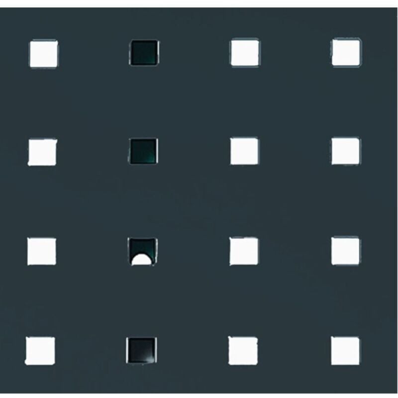 Simmetricamente perforato · in lamiera di acciaio spesso 1,25 mm · Spaziatura dei fori 38 mm · Dimensioni del foro 9,2 x 9,2 mm · particolarmente stabile a causa degli irrigidimenti attaccati alla schiena · Superficie verniciata a polvere · Bloccaggio con clip di plastica: montaggio di accessori senza attrezzi Altre caratteristiche tecniche: · Spaziatura dei fori: 38mm · Spessore piastra: 1,25mm