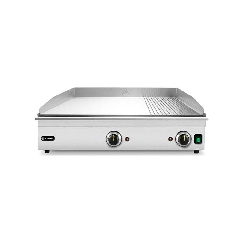 Alloggiamento in acciaio inossidabile. La piastra è realizzata in lamiera di spessore 8 mm, distribuisce e trattiene perfettamente il calore e può essere pulita in sicurezza con attrezzi appositi (raschietti, spazzole). Dotato di sponda posteriore e cassetto per la raccolta dei grassi e degli avanzi. Temperatura regolabile fino a 300°C. Protezione dal surriscaldamento tramite fusibile termico. Interruttore con LED integrato che indica il funzionamento. Piedini antiscivolo Piastra grill inserita ? La griglia rigata HENDI si distingue per una griglia in acciaio inox temprato e la capacità di raggiungere temperature fino a 300°C, che la rende ideale per la preparazione di carni grasse, come hamburger e salsicce. Allo stesso tempo, il lato liscio della griglia è perfetto anche per preparare uova o pancake. La combinazione del bordo posteriore e del cassetto raccogligrasso rimovibile rende il dispositivo facile da pulire. Dimensioni tavola 688×410 mm - in ? a coste, dentro ? liscio.