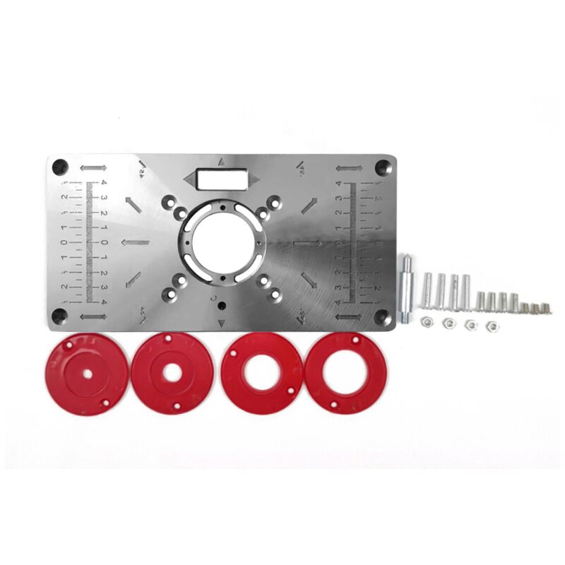 Un ensemble d'outils d'établi pour le travail du bois comprend 1 plaque d'insertion de table de toupie, 4 anneaux d'insertion de toupie et quelques vis de fixation. Spécifications: Matériau: plaque en alliage d'aluminium, anneaux en plastique Type: avec 4 anneaux d'insertion rouges, ;