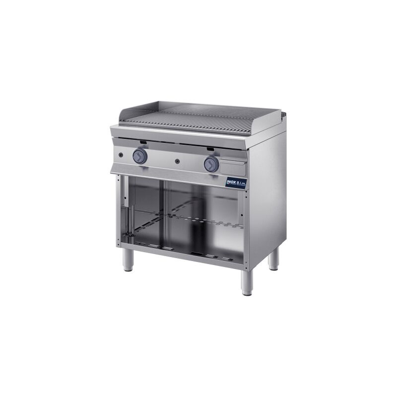Fry top a gas piastra rigata inox Bim. Le piastre, sono realizzate in acciaio spessore 15 mm e, durante il funzionamento, controllate da rubinetto termostato da 8 posizioni, temperatura massima 250/280°C. La zona di cottura ha una buona uniformità di temperatura e si espande per tutta la dimensione della piastra. La piastra nella parte anteriore è dotata di un canale raccogli grassi. Tutte le versioni, a richiesta, possono essere realizzate con piastra rivestita al cromo duro. Nelle versioni con piastra cromata viene montato un termostato di sicurezza. Smontando il cruscotto esterno è tutto a portata di mano e tuttii componenti si possono sostituire dal lato anteriore della macchina. Il cassetto raccogli liquidi estraibile permette di fare velocemente le operazioni di puliziaFry top a gas piastra rigata inox Bim. Qualità ottima. Per Alberghi e grandi impianti di Ristorazioni. Ottime prestazioni. Visita sito.800x900x850/900H - Kg.145 - Kw.18
