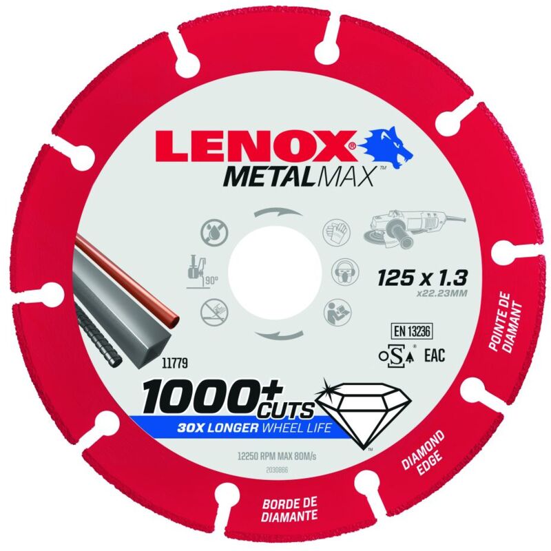 Forniture del prodotto Tecnologia diamante innovata per una durata estrema e prestazioni massime di lavoro | Il foglio può eseguire 1000 o più tagli e contiene 30 volte più a lungo dei dischi da taglio sottili * | La foglio è occupata dal diamante e non è più piccolo, la profondità di taglio rimane Invariato durante l'intera vita di servizio portante più forte di acciaio solido per evitare il rischio di rottura in gran parte | Lenox Metalmax ™ funziona odore e duplicato, poiché il disco non si indossa come abrasivi legati. Solo il materiale tagliato ha sviluppato scintille visibili | Funziona in una varietà di materiali come acciaio, acciaio inossidabile, ghisa, ferro da stiro, lamiera, alluminio e metalli non ferrosi | * Potenza media del MetalMax ™ rispetto a un 115 x 1 MM Disco da taglio con ossido di alluminio rilegato abrasivo in tubo da 25 mm in acciaio al carbonio