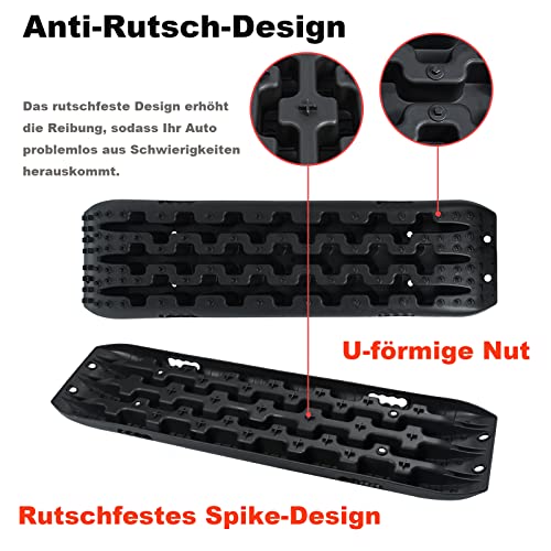 Dimensioni del prodotto: 106 x 29,5 x 7 cm, 5,4 kg per coppia. L'ausilio di trazione è realizzato in HDPE elastico rinforzato, resistente al calore, all'usura, ai raggi UV, non corrosivo e non facilmente deformabile e infrangibile dopo l'estrusione. Aiuta facilmente gli pneumatici a uscire da situazioni bloccate senza dover spalare o trainare noiosamente